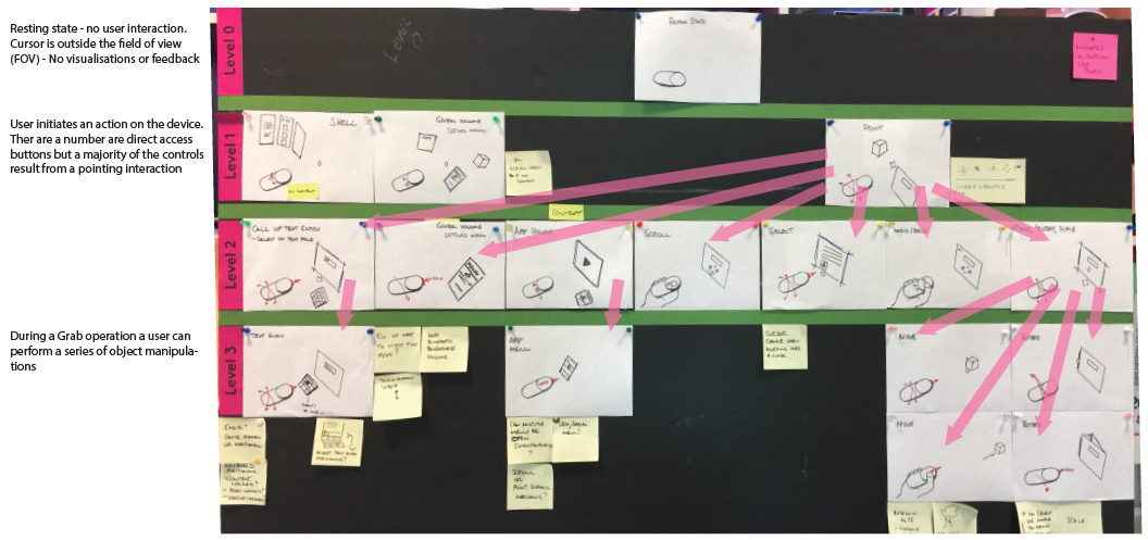 Working board for interaction schemes. I communicated interaction schemes on large foamboards with sketched product interactions. The value of this approach was that we could work in an agile fashion, prototype quick and catch design oversights early.